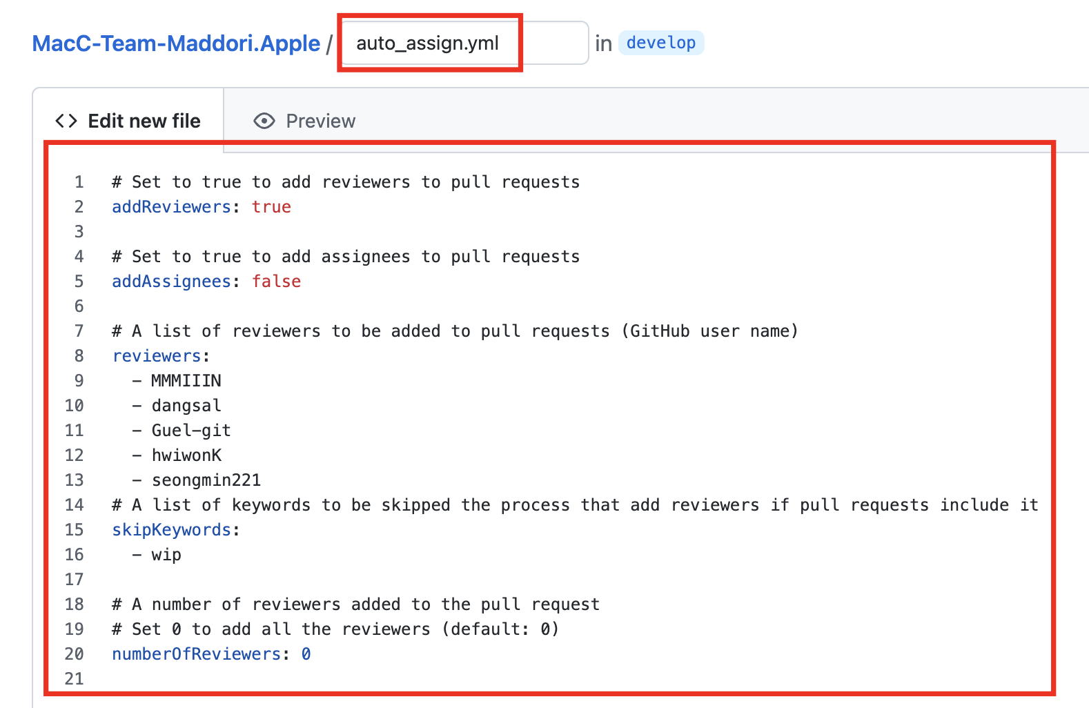 6. 깃허브에 auto_assign.yml 파일을 추가합니다. (택 1)