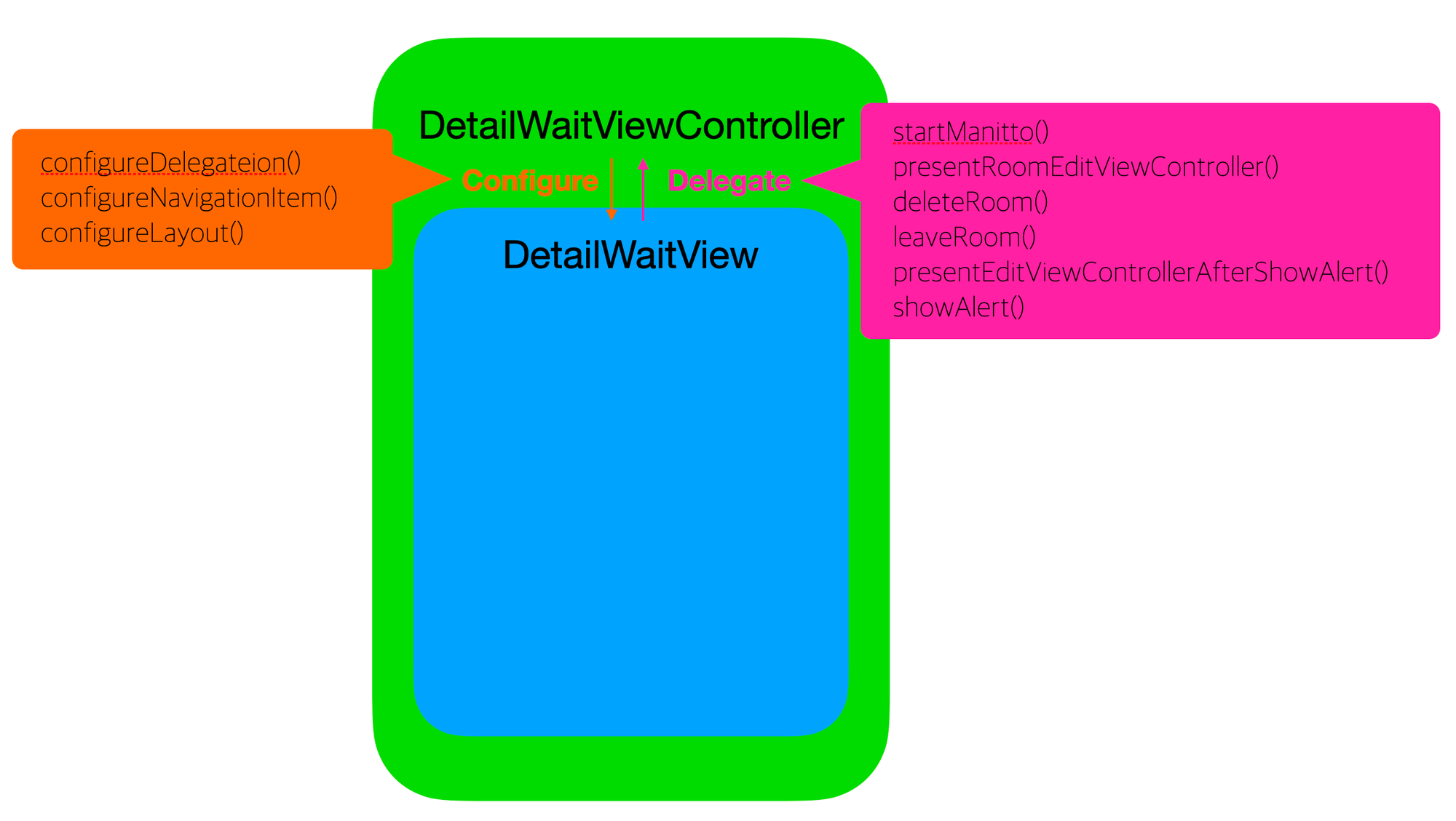 DetailWaitViewController 내부에 View가 있고 View의 action들은 ViewController로 delegate해줄 것이고 View의 UI를 그리는데 필요한 것들은 configure 해줌으로서 해결할 예정이다.