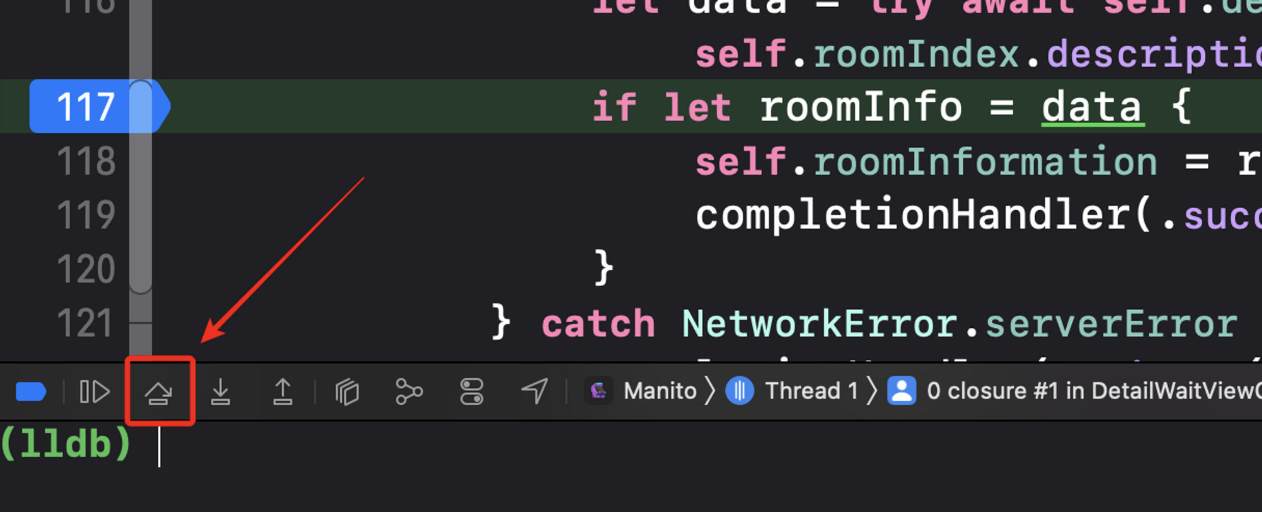 위와 같이 BreakPoint가 걸리고 앱이 중단된다.