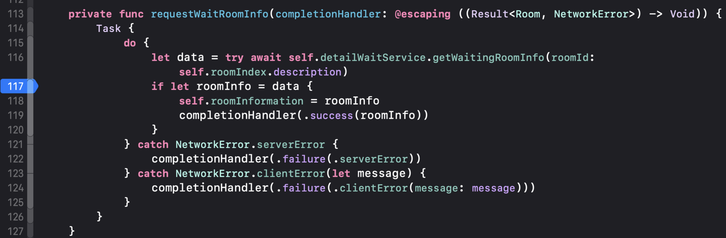 private func requestWaitRoomInfo(completionHandler: @escaping ((Result<Room, NetworkError>) -> Void)) {