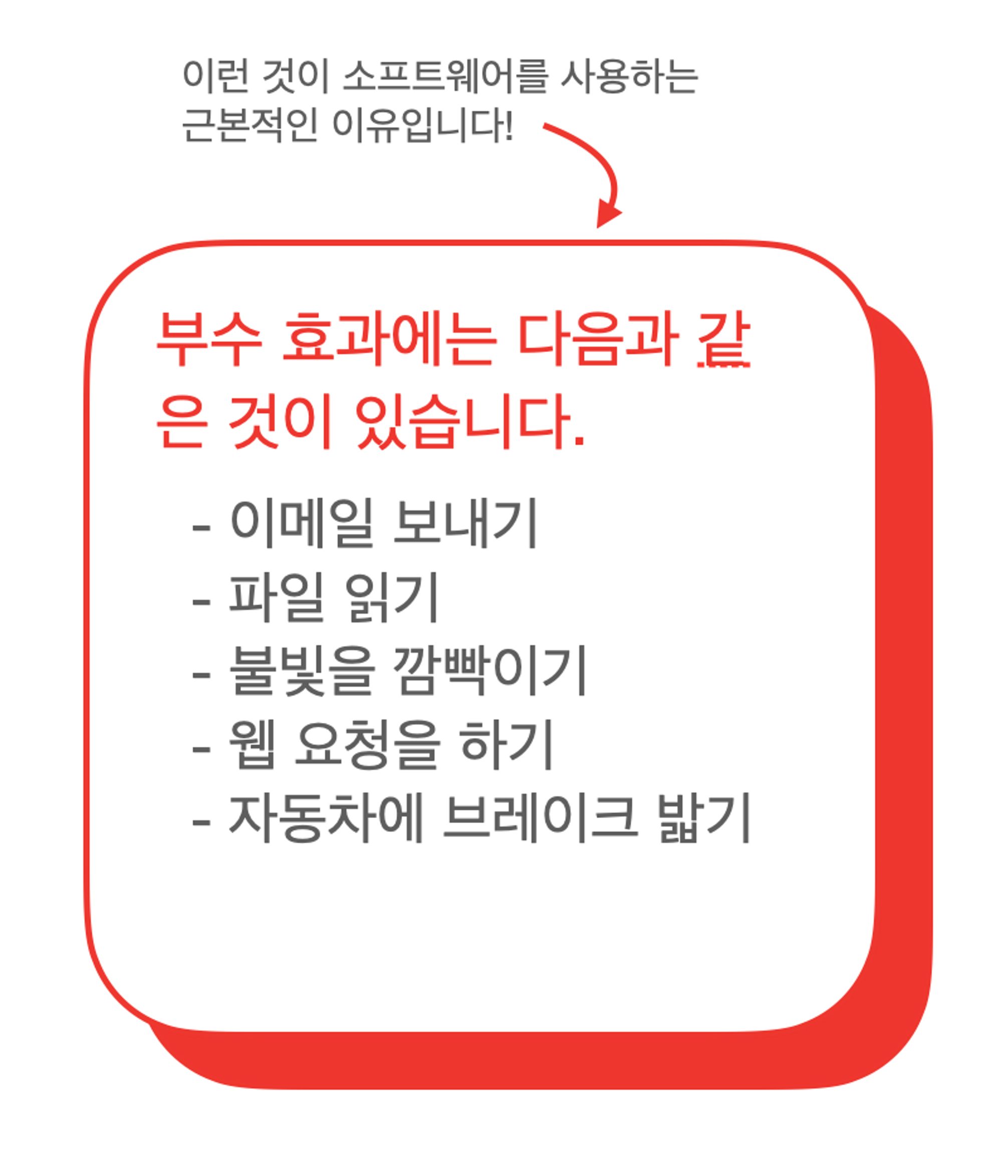 부수 효과는 함수가 리턴값 이외에 하는 모든 일을 말합니다. 예를 들어 메일 보내기나 전역 상태 수정하기 같은 일이 부수 효과입니다.