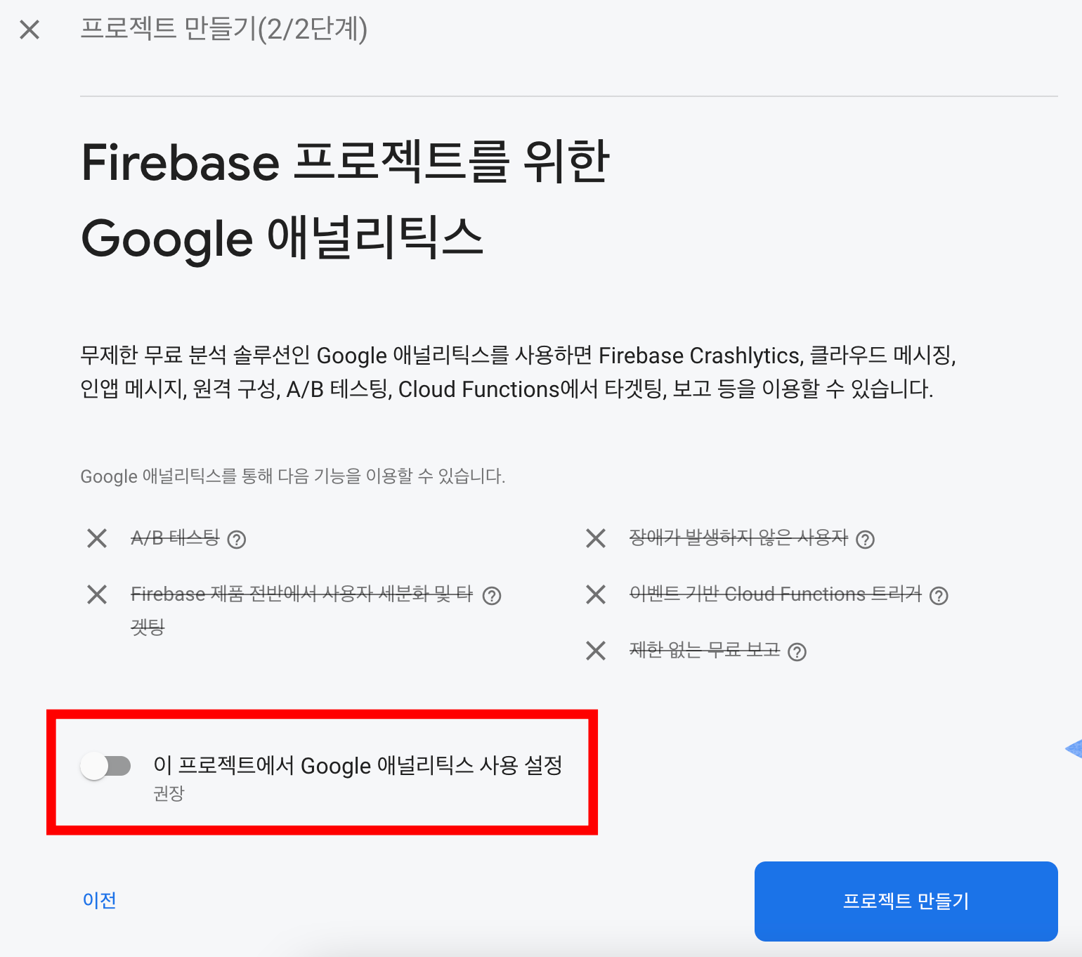 Analytics는 사용 설정해도되고 안해도 되는데, 실제 출시할 앱이면 사용하는 게 좋지만 지금은 연결방법정도만 알아보는 과정이기 때문에 설정을 하지 않았다. (사용 설정해도 상관 X)