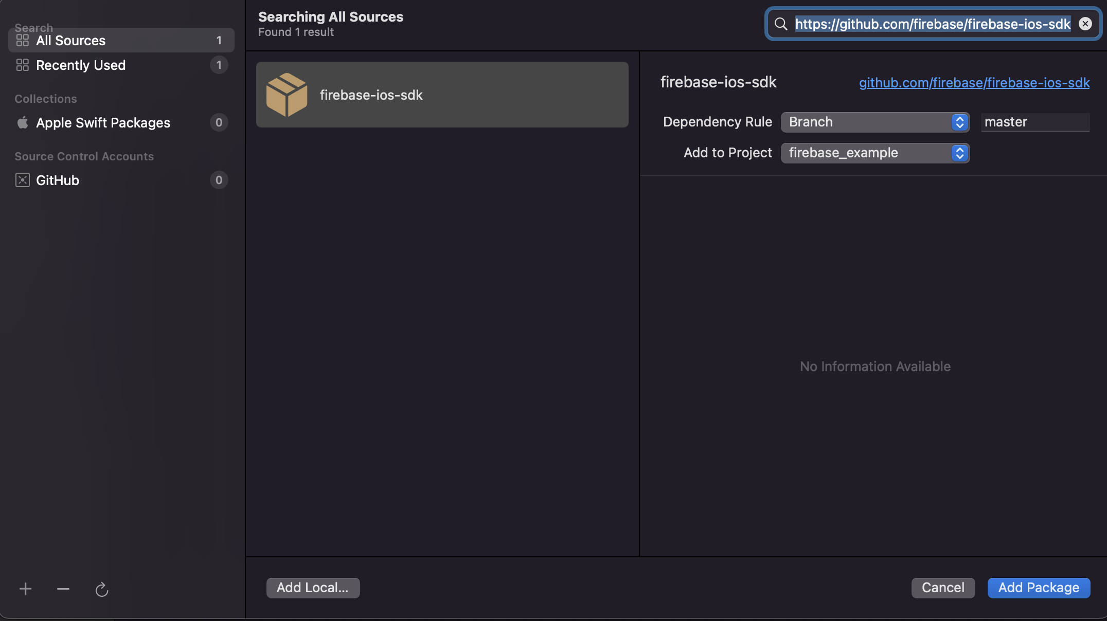github URL을 입력후 Add Package